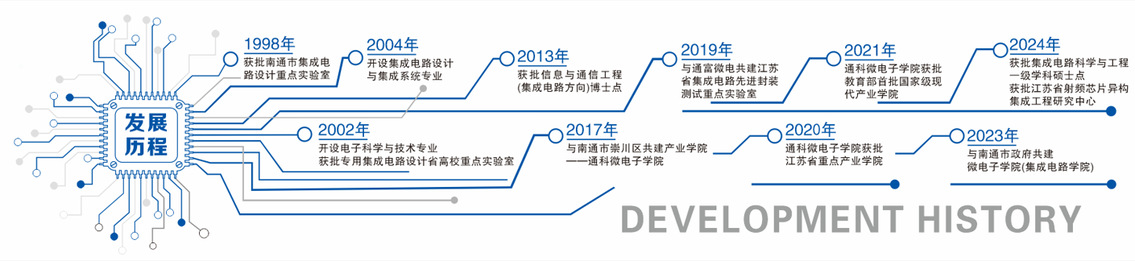 日本色情片 集成电路相关专业的发展可溯源至上世纪90年代,是国内较早开展集成电路教学科研的高等院校之一。1998年成立了南通市集成电路设计重点实验室;2002年,经教育部批准开设电子科学与技术专业,同年获批专用集成电路设计省高校重点实验室;2004年开设集成电路设计与集成系统专业;2013年,获批信息与通信工程一级学科博士点,下设通信与信息系统集成电路二级学科博士点;2017年与南通市崇川区合作共建产业学院——通科日本色情片 ;2019年与通富微电共建江苏省集成电路先进封装测试重点实验室;2020年通科日本色情片 获批江苏省重点产业学院;2021年获批教育部首批现代产业学院;2024年重组获批半导体器件与集成电路设计封测省高校重点实验室,申报获批集成电路科学与工程一级学科硕士点、江苏省射频芯片异构集成工程研究中心。